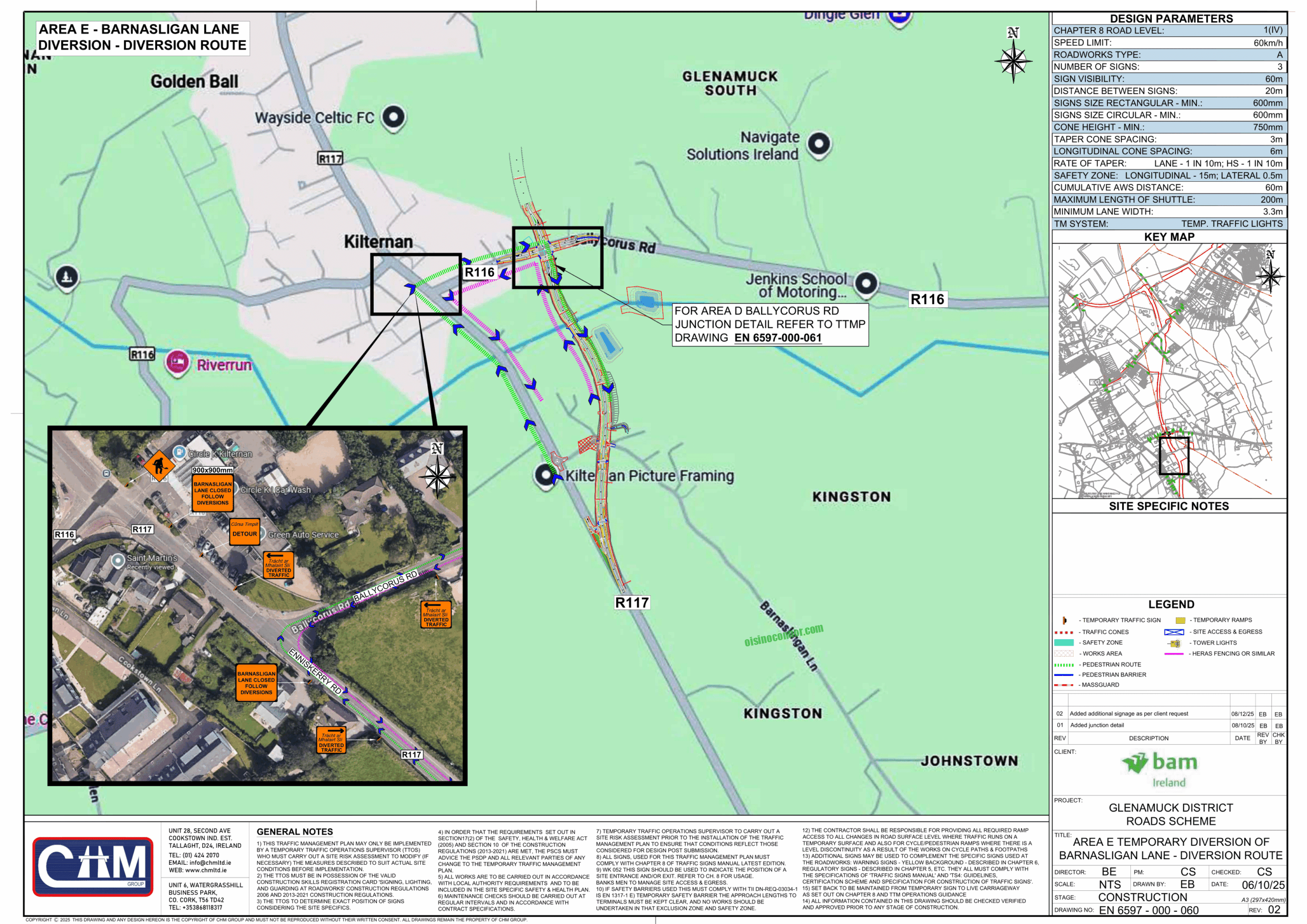 Barnaslingan Lane will be permanently closed to through traffic at its intersection with the Glenamuck Link Distributor Road (GLDR), while maintaining access for pedestrians and cyclists. As construction of the GLDR progresses, this closure is scheduled to take effect from mid- February (w/c 16/02/2026). Since the Enniskerry Road South tie in is not yet ready and open to traffic, a specific Traffic Management Plan (TMP) will be implemented to accommodate the interim traffic diversion. Pedestrian and local access will be maintained at all times, and diversion routes will be clearly signposted. Please find attached diversion routes and TMPs to be implemented for both Ballycorous Road and Barnaslingan Lane junctions.
